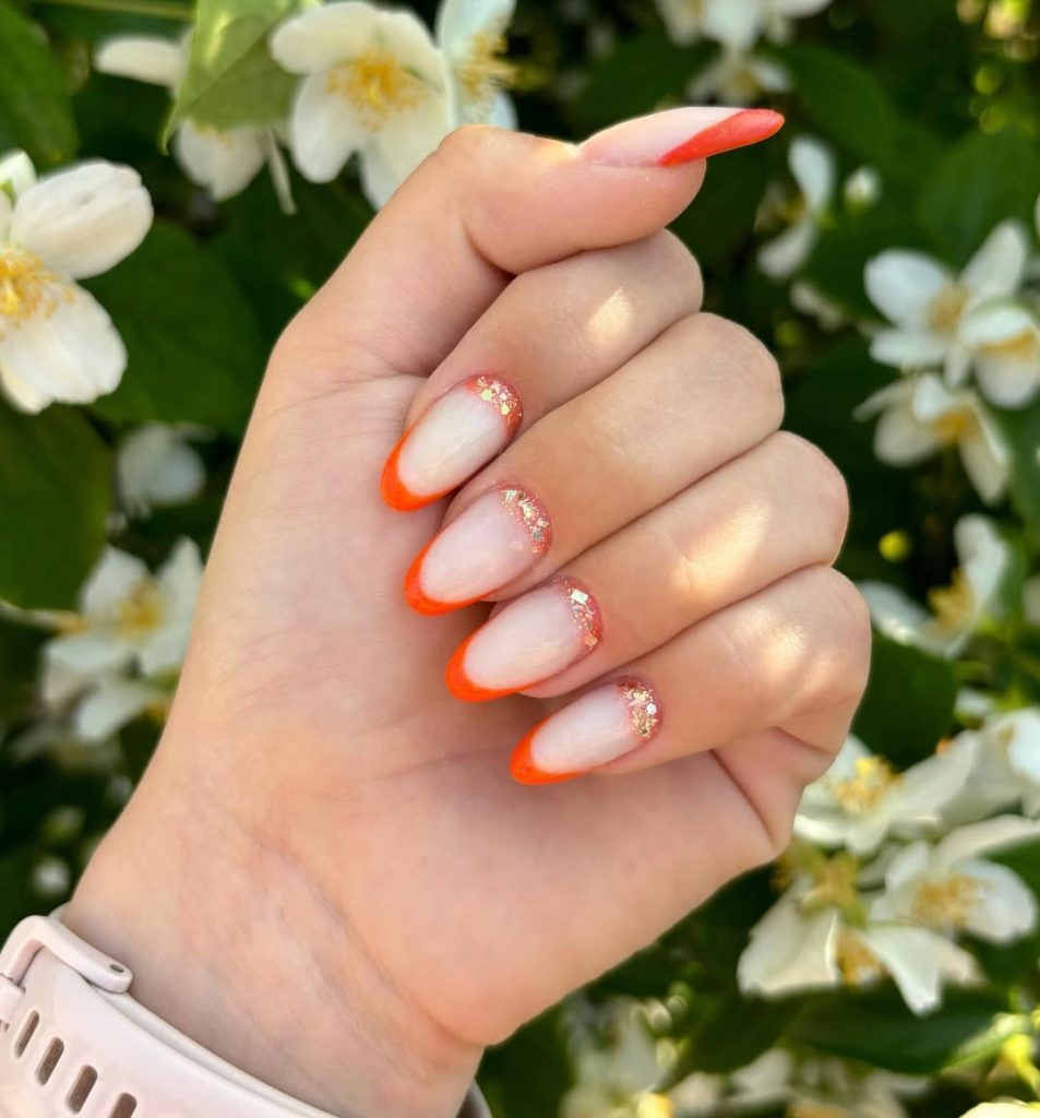 These orange French tips feel warm, joyful, and full of spring optimism. The bright color brings energy to the nails, and the soft sparkle near the base adds a touch of elegance. It’s a beautiful balance of playful and classy, perfect for welcoming brighter days.