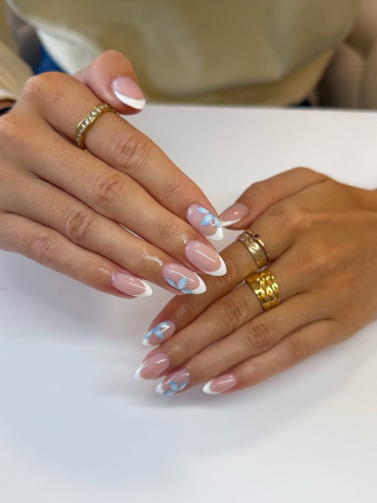 26. Soft Blue Flower: French Tips for Almond Short Nails