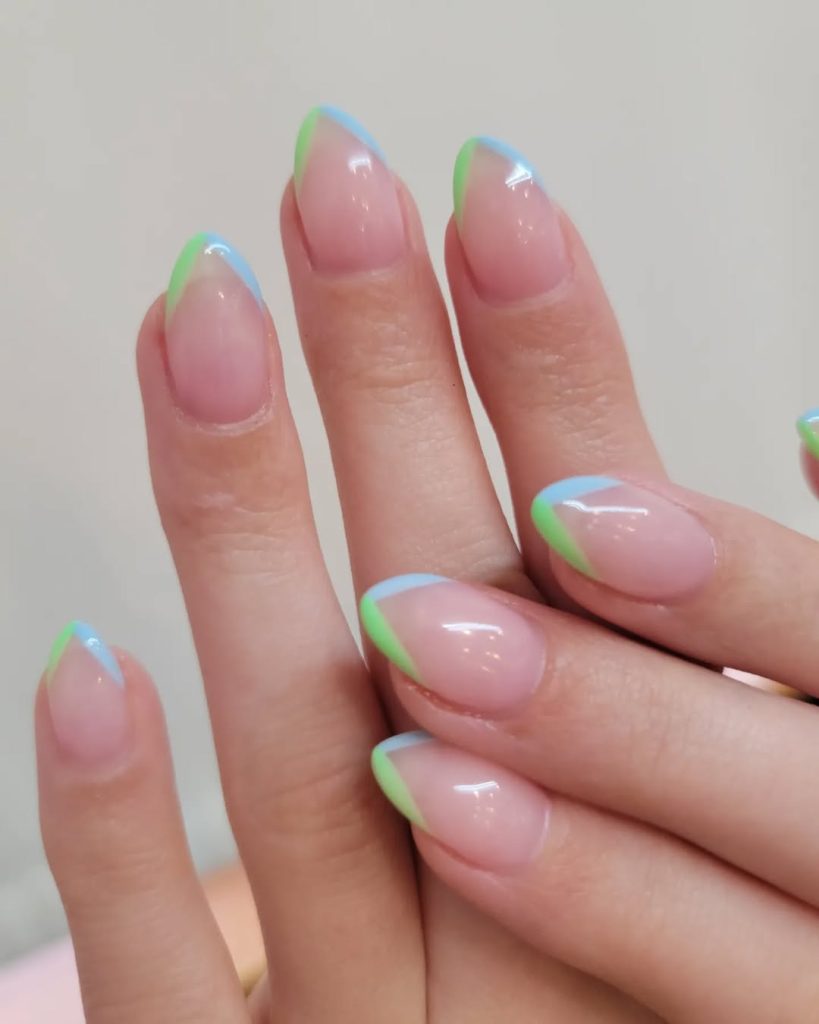 The blue and green French tips are simply calm, modern, and artistic. The colors are also perfect for spring with a soft and airy mood. The design is also very thoughtful with the small details. It is sleek with no harsh shapes, making it a perfect design to appreciate small detail.