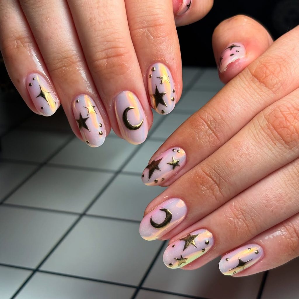 1. Golden Moon and Star Glow Nails