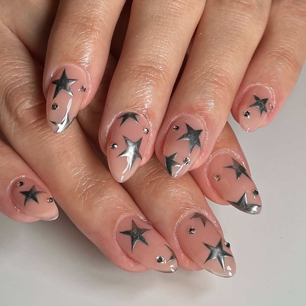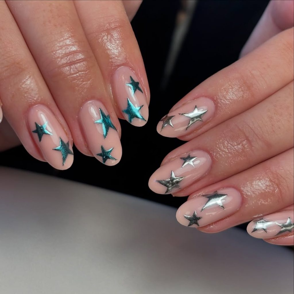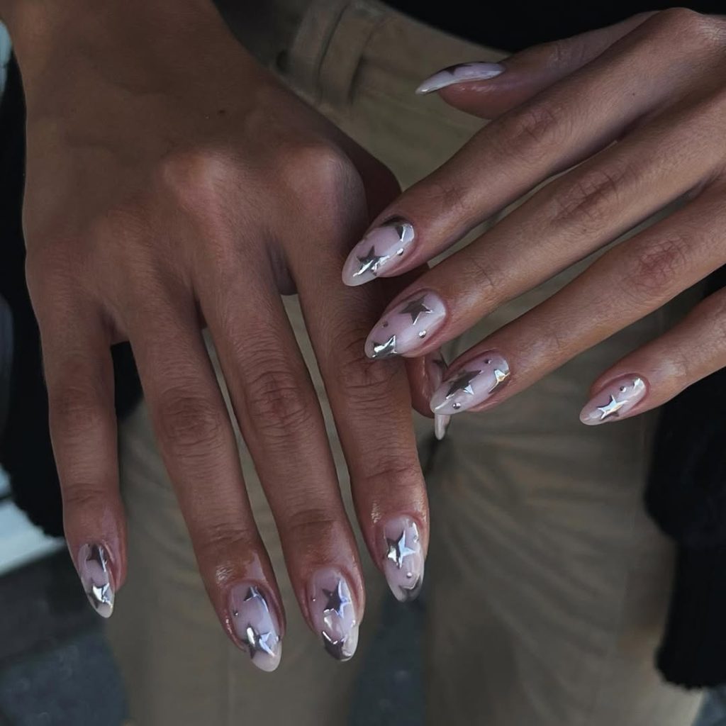 There’s a dreamy softness to these star nails, where the chrome accents melt gently into the nude base. The blend gives a cloud-like, ethereal look—delicate, feminine, and quietly enchanting. Each star seems to glow from within, creating a subtle shine that feels romantic rather than bold.