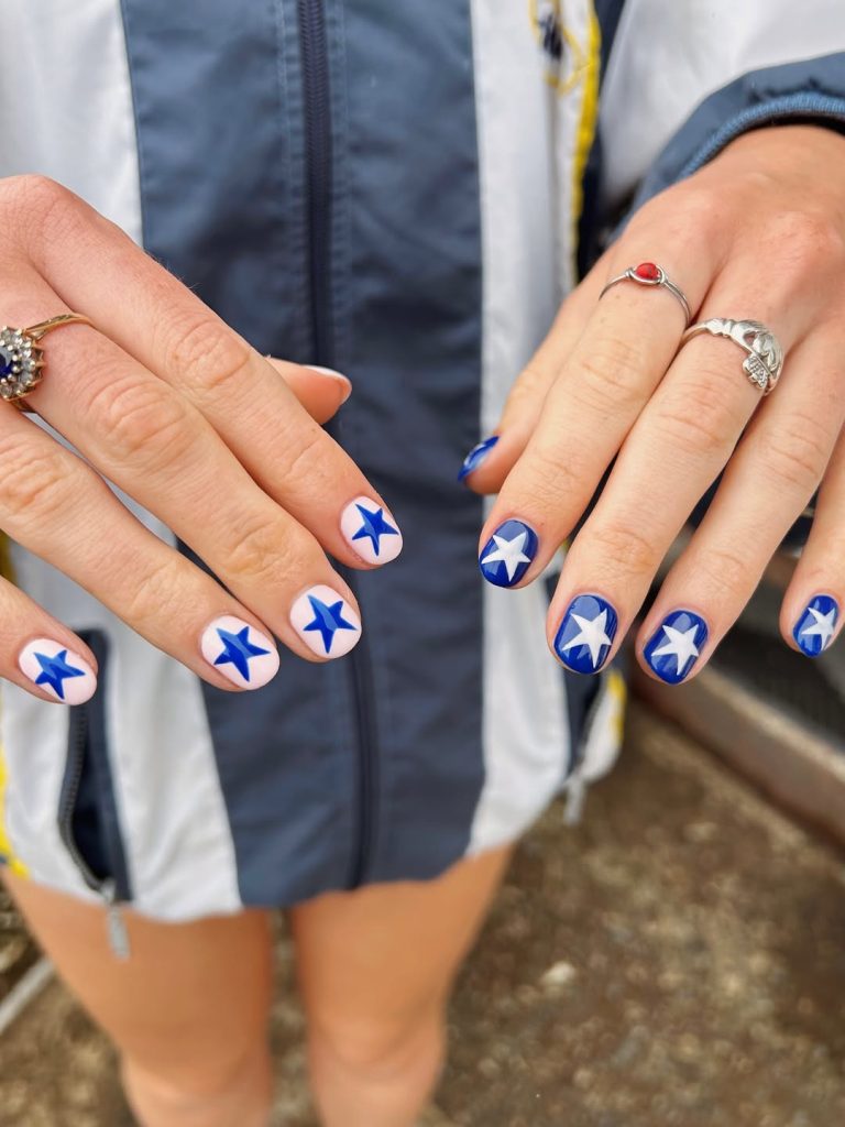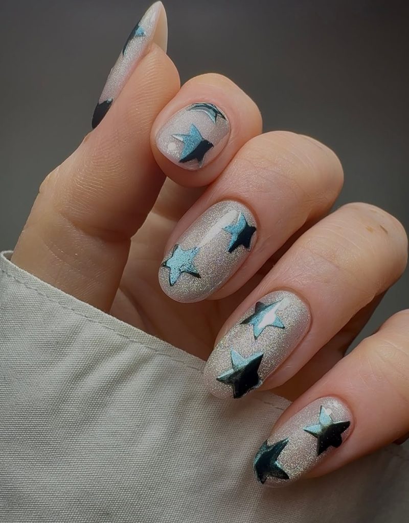 If you love inspiration that is slightly unexpected, this style is perfect for you. The metallic blue stands out beautifully on both fine and thicker nails, and the chrome-like finish keeps the design feeling polished. What makes this technique stand out from other star nails is the dimensional effect—the layered blues add movement, making each star feel like it’s floating. A fun, fresh twist if you’re craving something a little different.