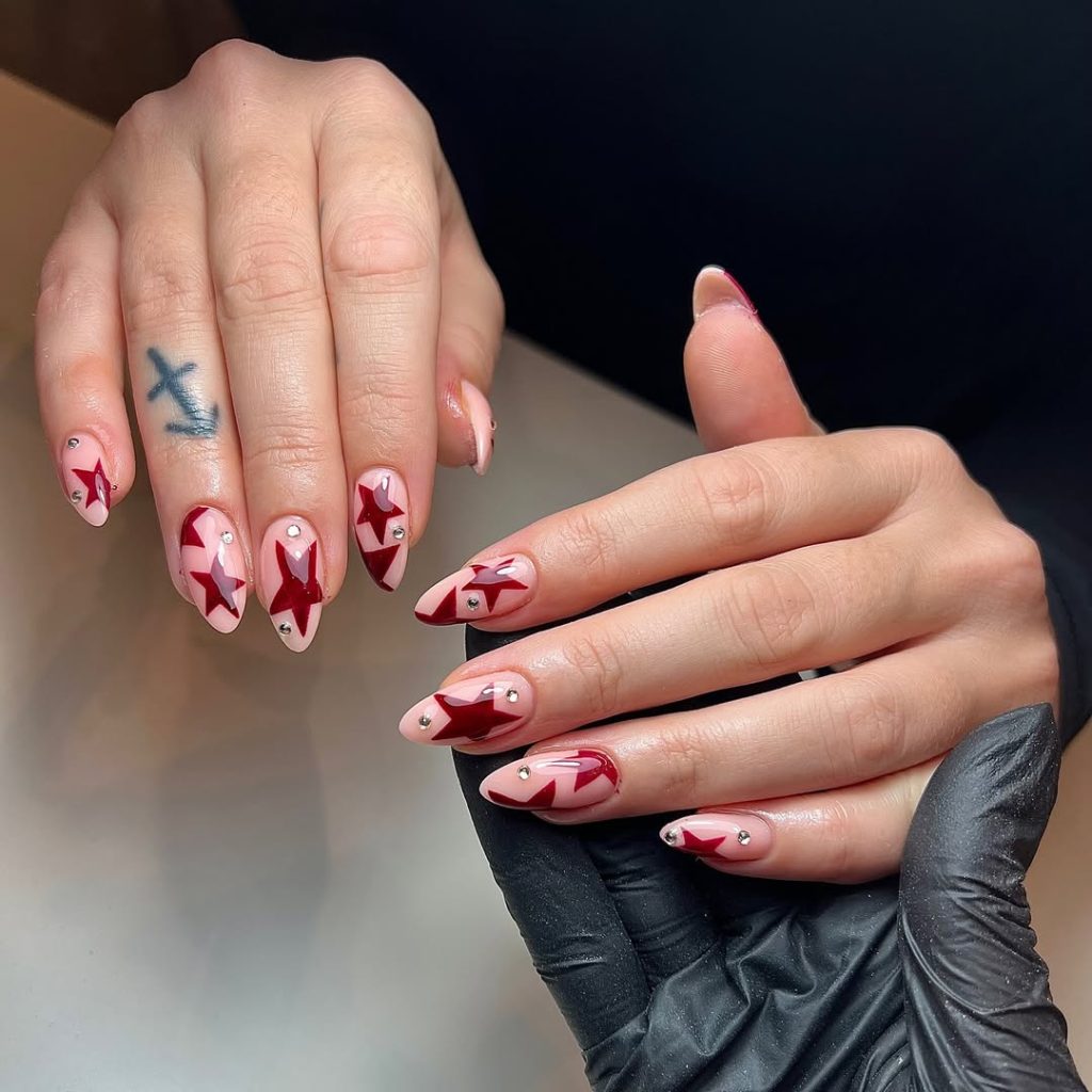 This design is ideal if you love inspo that feels both adorable and classy. The contrast between the red and the nude base makes the stars stand out clearly, and the crystal accents add an extra touch of art without complicating the look. It’s a great option for medium or long nails, especially if you want something stylish that still feels easy to wear.