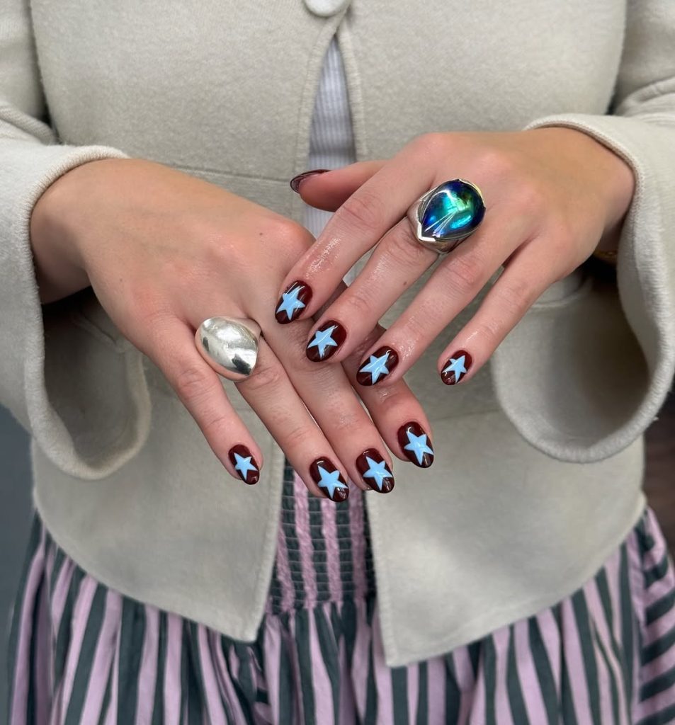 These light blue stars against a deep burgundy base create a deliciously rich color pairing that feels warm, bold, and modern all at once. The combination has a playful edge but still looks refined, especially when paired with silver jewelry or textured fabrics. It’s a look that feels expressive without trying too hard—a perfect everyday statement.