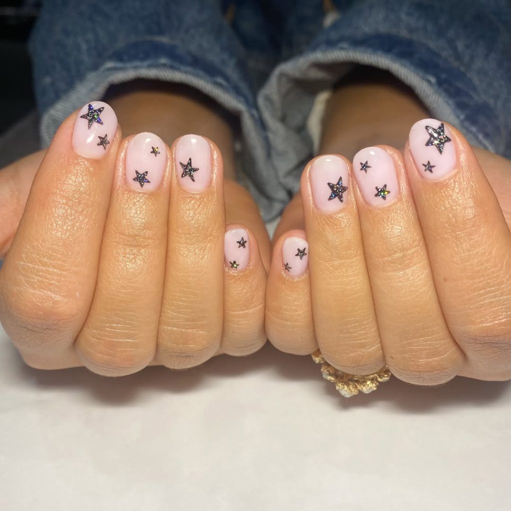 Clean, modern, and effortlessly chic—these silver star outlines give the soft blush base a sophisticated, almost architectural feel. The design is understated but still full of personality, and it has that polished simplicity that feels right at home in both everyday life and more dressed-up moments. It’s minimal inspo with just the right amount of edge.