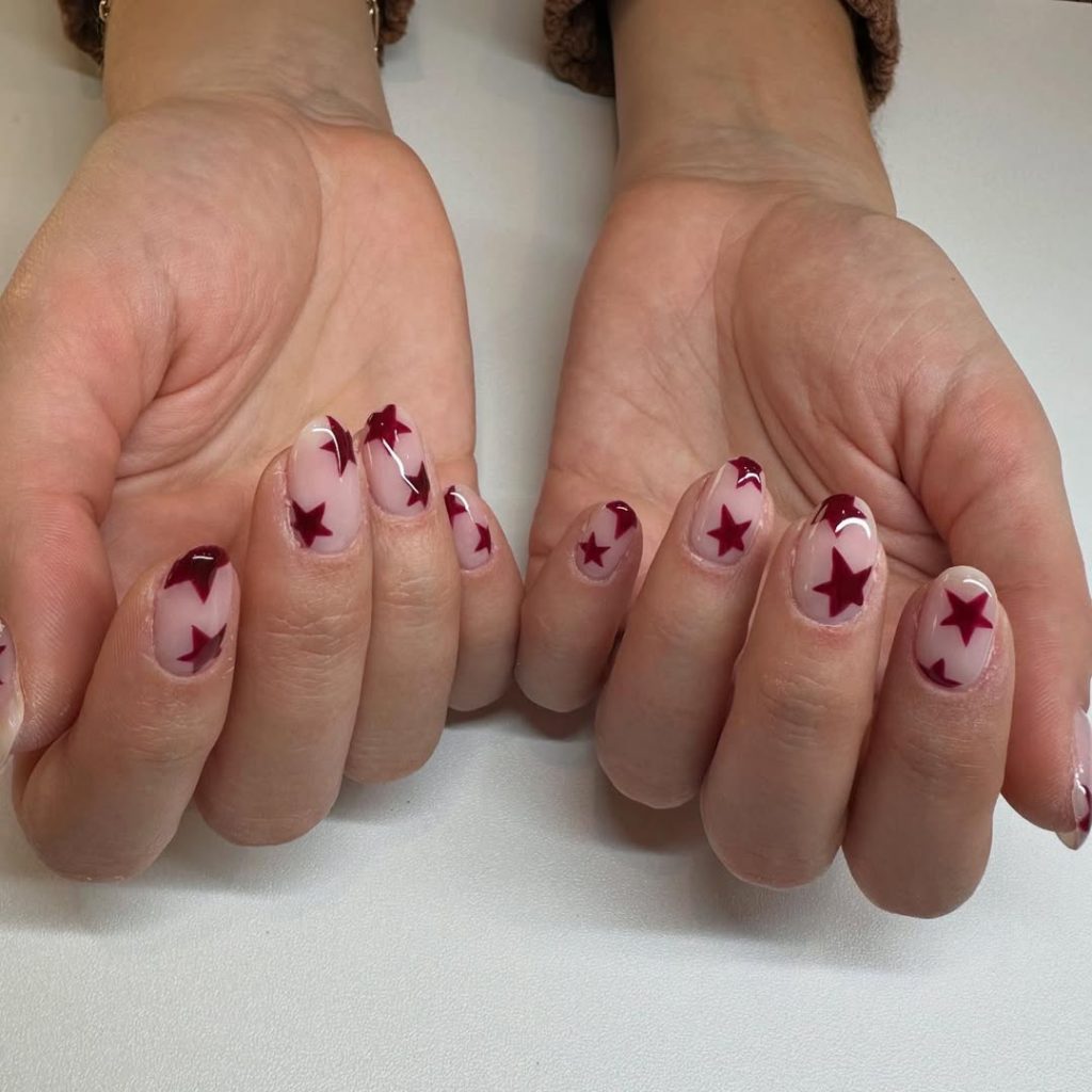 This design is perfect if you enjoy ideas that mix simple shapes with bolder details. The burgundy tones flatter most skin tones and pair beautifully with both short and long nails. What makes this set special is how versatile it is: the polka dots add a sweet twist, while the stars keep everything firmly in the inspo category. A wonderful pick if you want something lively without being overwhelming.