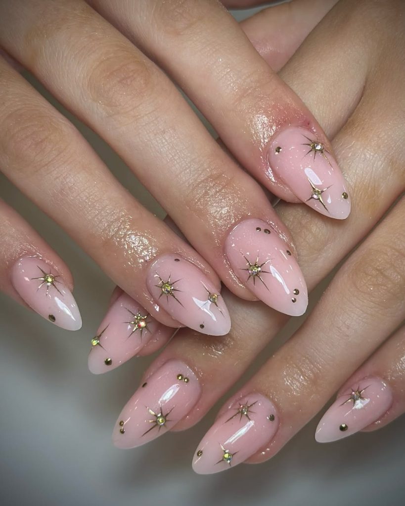 These soft pink nails with delicate gold starbursts have such a dreamy, romantic feel. The gentle ombré fade adds depth while allowing the tiny gold accents to shimmer subtly across the surface. It’s elegant and airy, the kind of manicure that feels quietly beautiful every time you catch it in the light.