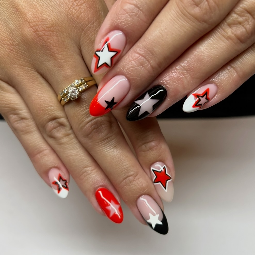 This bold combination of red, black, and white stars has such a fun, high-energy vibe. It feels playful without losing its stylish edge, almost like a retro pop-art moment on your fingertips. Each nail offers its own little twist, making the whole look feel dynamic and full of personality. If you love colorful designs that instantly brighten your day, this one’s a joy.