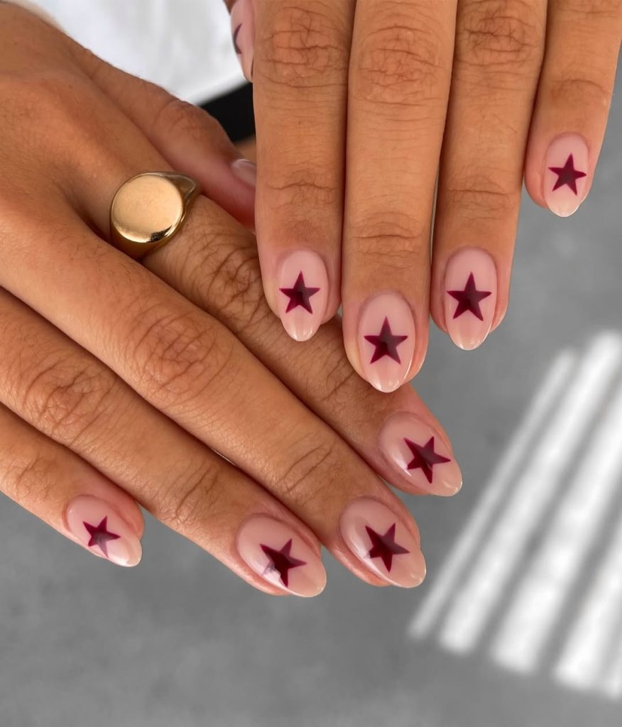 These stars exhibit a cozy warmth and subtle prestige. The design stays clean and simple, but the starry shape in the burgundy is an extraordinary richness. The balance in the star is the perfect nude, maximizing the design and allowing the stars to softly dominate. The color combination is a perfect balance.