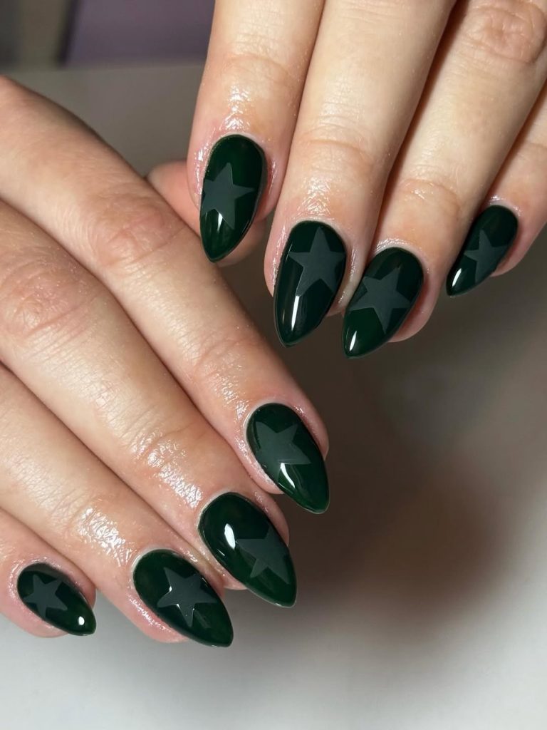 7. Deep Green Star Glow Nails