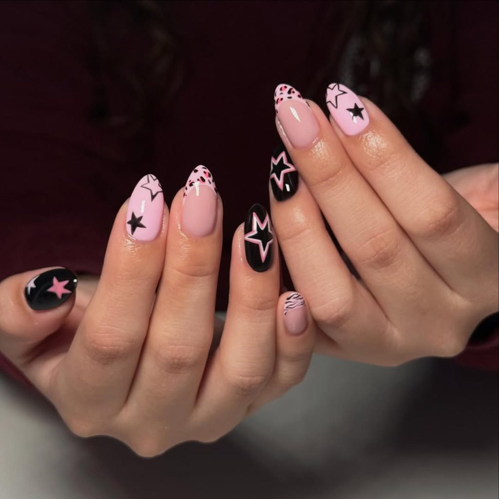 8. Pink and Black Star Mix Nails