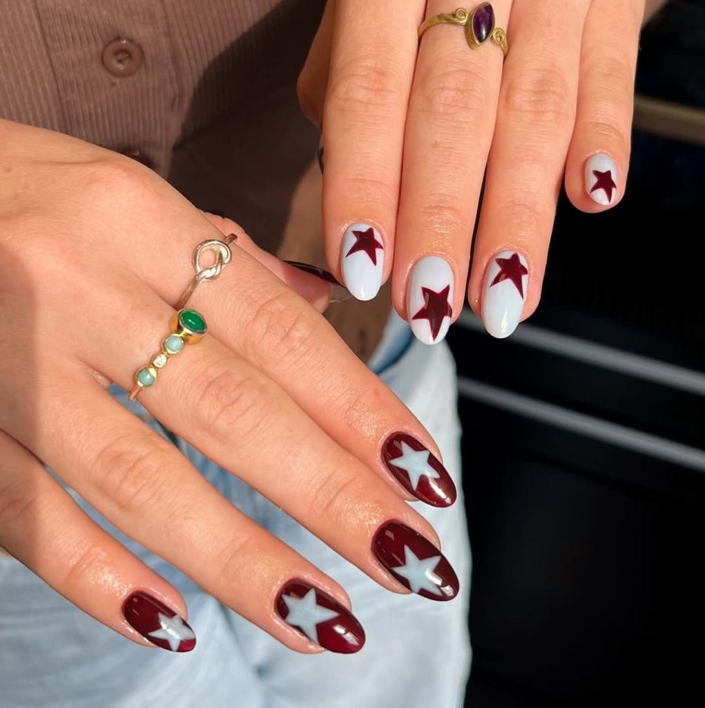 9. Burgundy and White Star Contrast Nails