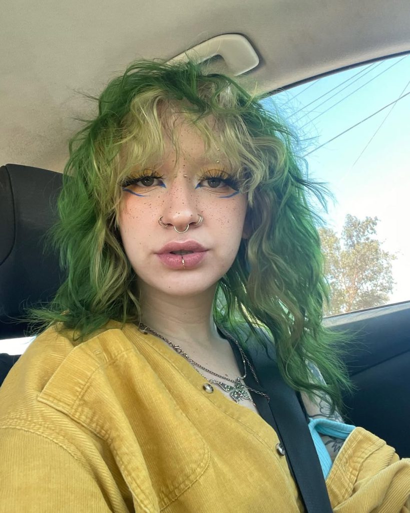This look feels like pure creative freedom. The blend of bold Green tones with a textured, slightly undone shag gives off an effortlessly cool, artistic vibe. It is spirited, somewhat defiant, and brimming with character—suggesting that you have chosen to make this summer exclusively about pursuing your own path. The softness of the fringe balances the intensity of the Color, making it feel surprisingly wearable.