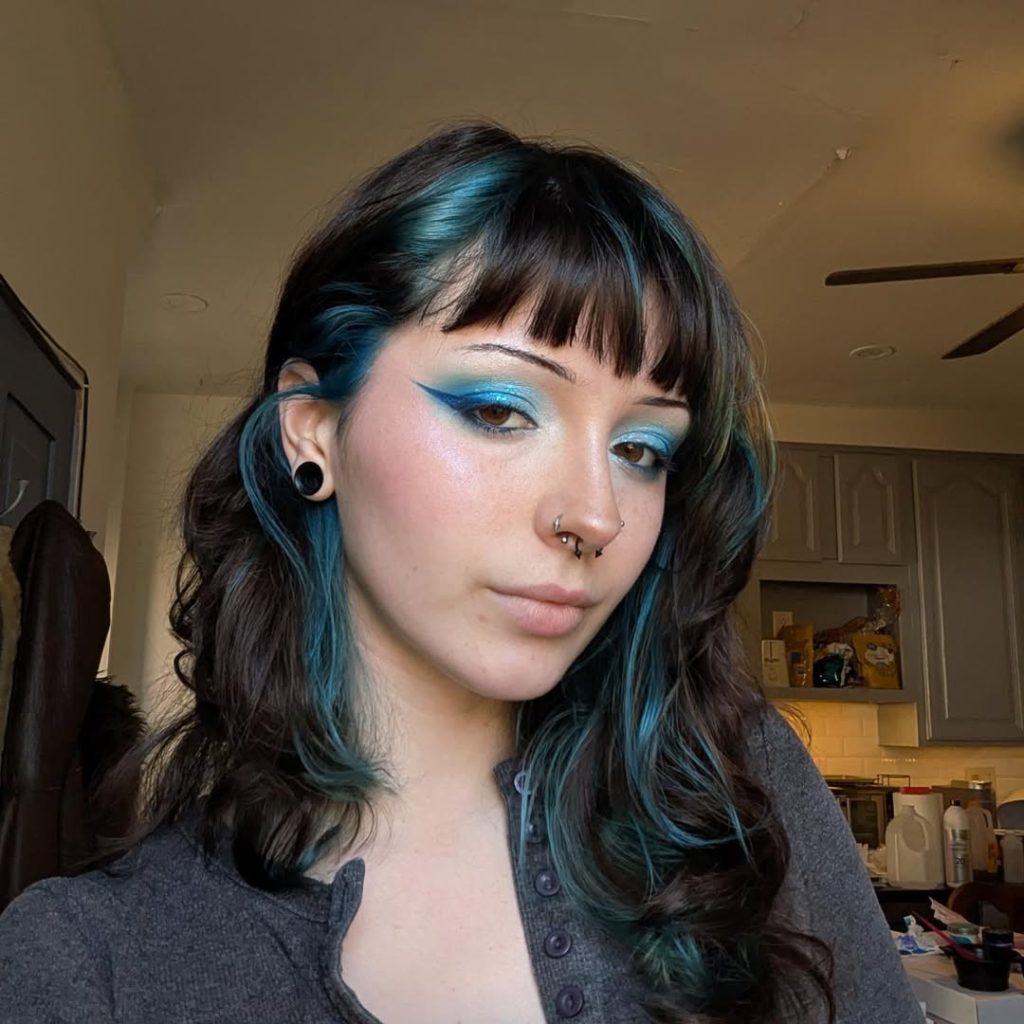 This look is all about subtle edges. The deep, dark hair base, paired with cool blue and teal accents, creates a striking contrast that feels modern and just a little bit rebellious. It’s not loud, but it definitely makes a statement—like a quiet confidence that doesn’t need to shout.