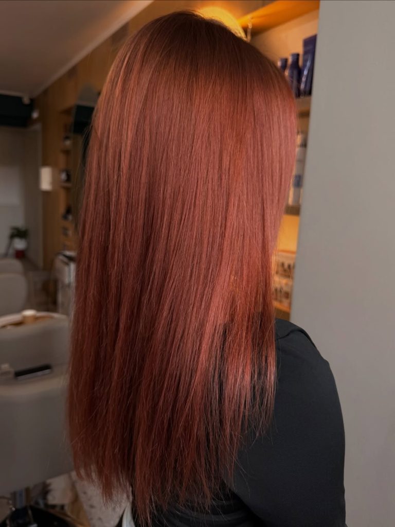 This glowing Red shade feels warm, confident, and beautifully timeless. It has that deep, coppery richness that instantly brings life to the hair, catching the light in the most flattering way. There’s something quietly powerful about this Color—it doesn’t need to be loud to stand out. It simply enhances everything around it.