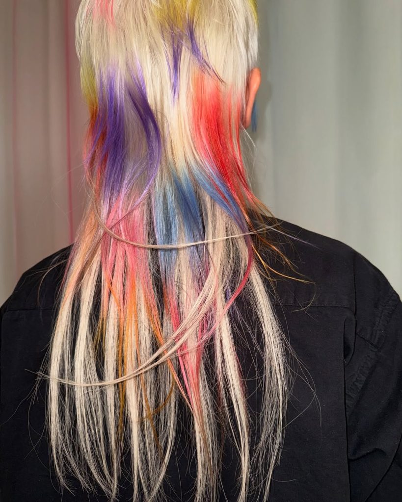 At first glance, this Blonde base looks clean and minimal—but then those hidden streaks of Purple, Blue, and Pink peek through, adding a playful twist. It feels artistic and unexpected, like a secret layer of personality woven right into your hair. The contrast between soft and bold makes it especially fun to wear.