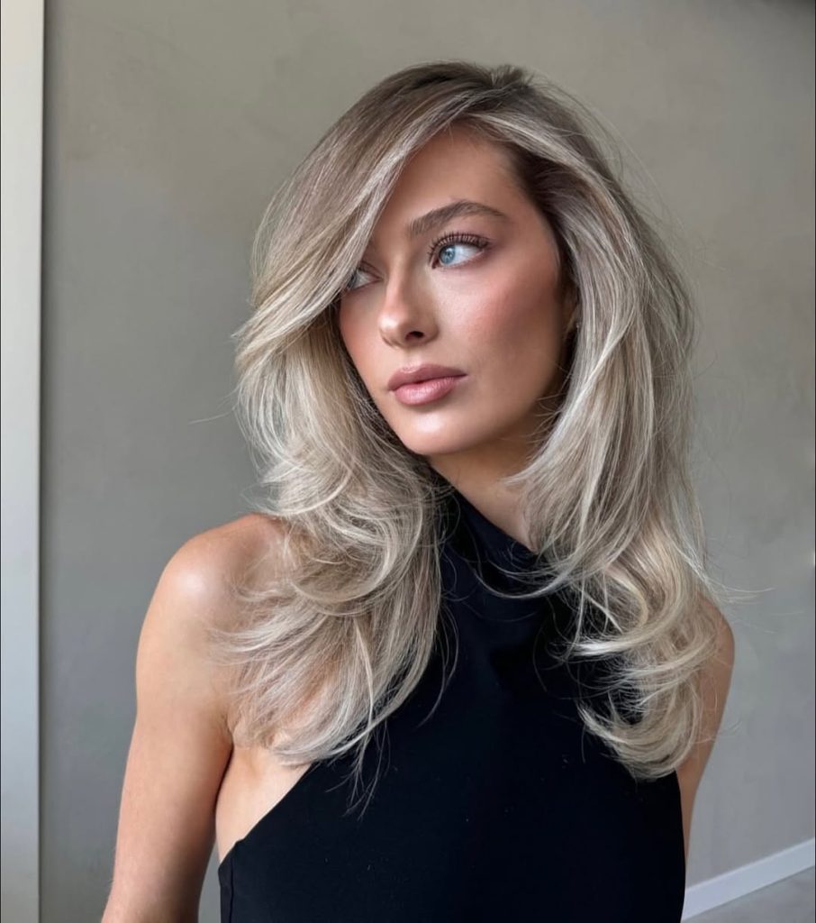 This style is ideal for blondes who want a modern refresh without going too bold. The layered cut adds volume to fine hair, and a round brush blowout enhances the Soft, feathery finish. It’s very much in line with 2026 trends, where natural-looking dimension and movement take center stage.