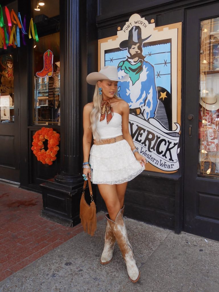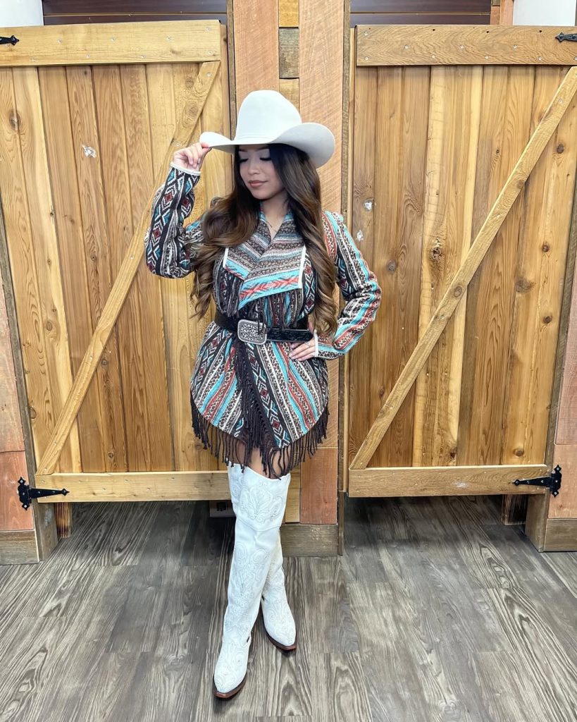 This ensemble has so much fashion flair—the dress itself has a pattern, the fringes at the bottom of the dress provide visual interest, and the bold belt provides a cute yet strong western fashion statement. The white hat and the high boots provide the perfect contrast to the earthy colors and provide this fashion statement with a modern twist.