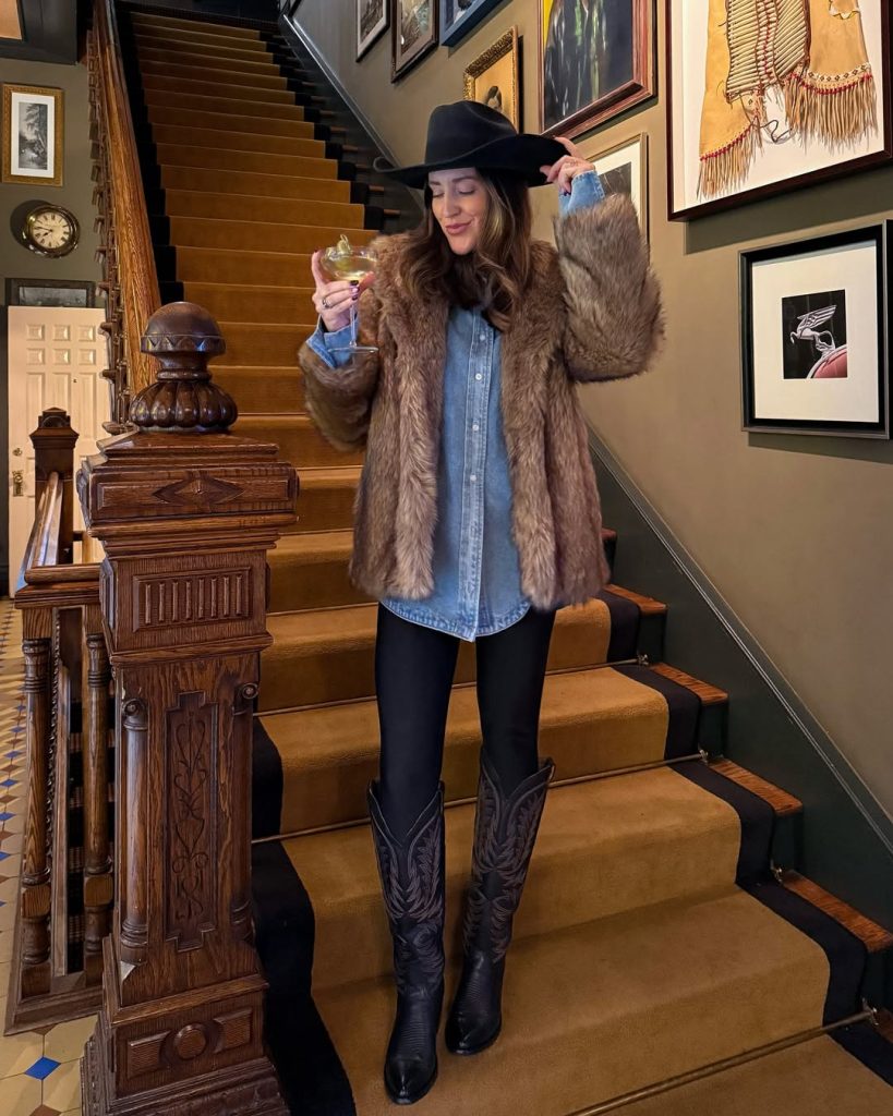 This collection of outfits perfectly captures the essence of the warm weather of the western world in this glamorous winter version of the western fashion trend—the faux fur coat perfectly complements the western fashion trend of the tall embroidered boots and the elegant white hat that adds the perfect touch of the wild side of fashion. What makes this one unique is that it can be worn during the cold winter seasons without sacrificing its fashion.