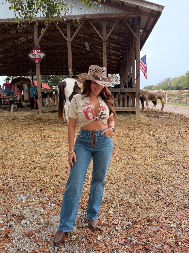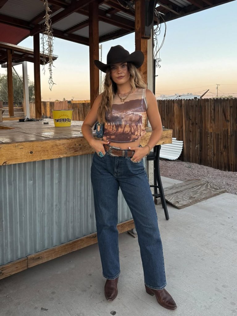 There’s a playful and sweet quality to this outfit—the graphic tee, the lace-up jeans, the straw hat, and the sweet smile convey this cute and carefree cowgirl spirit perfectly. This cute outfit doesn’t only appear shiny and trendy but also pretty classic and nostalgic.