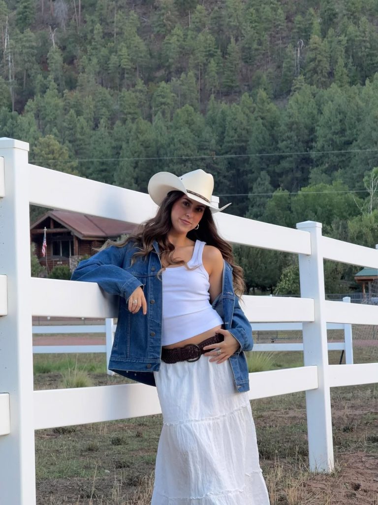 This particular dress has an extremely romantic feel to its western setup—the long white maxi skirt paired with the white tank top and the denim jacket paired with the classic white hat makes this collection merge perfectly to create a dreamlike effect that’s both romantic and chic.