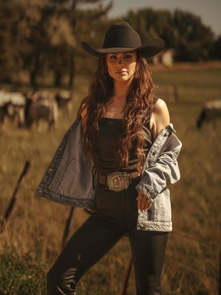 This fashion needs no introduction because it already has the dramatic flair of bold women who embody the fearless power of western fashion itself. The long waves of the hair do a lot to create this impact, along with the dark hat and the denim jacket draped carelessly over the shoulder. This particular fashion statement makes clear that she’s ready for whatever comes next: a casual ride at the onset of the sunset to a full photo shoot.