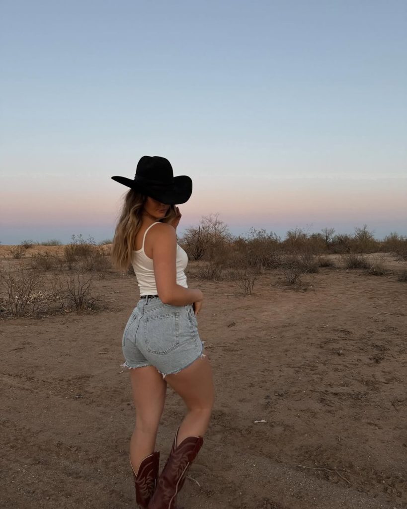 This fashion has the soft and moody quality of the best shots available only at the right moment of the day—at sunset. The white tank top, the easy-to-wear denim shorts, and the dark-brown boots create an effortless romantic fashion statement that looks sweet and fashionably gorgeous. The addition of the dark-colored hat provides the best fashion accent, adding the perfect wild touch of the old west to the image.