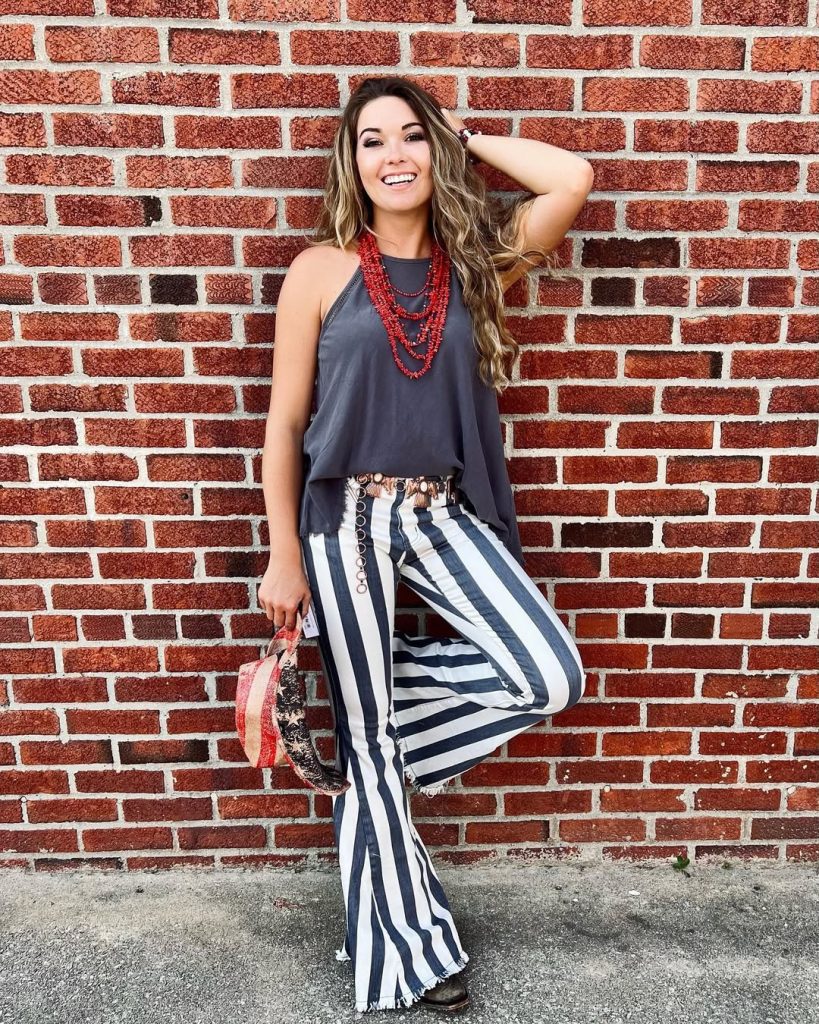 Stripe flares are in for the summer and fall seasons and will provide you with a unique spin on the typical western cut. The loose-fitting top provides plenty of movement and makes this the perfect ensemble to wear on nights out at the party when you want to provide a bold fashion statement.