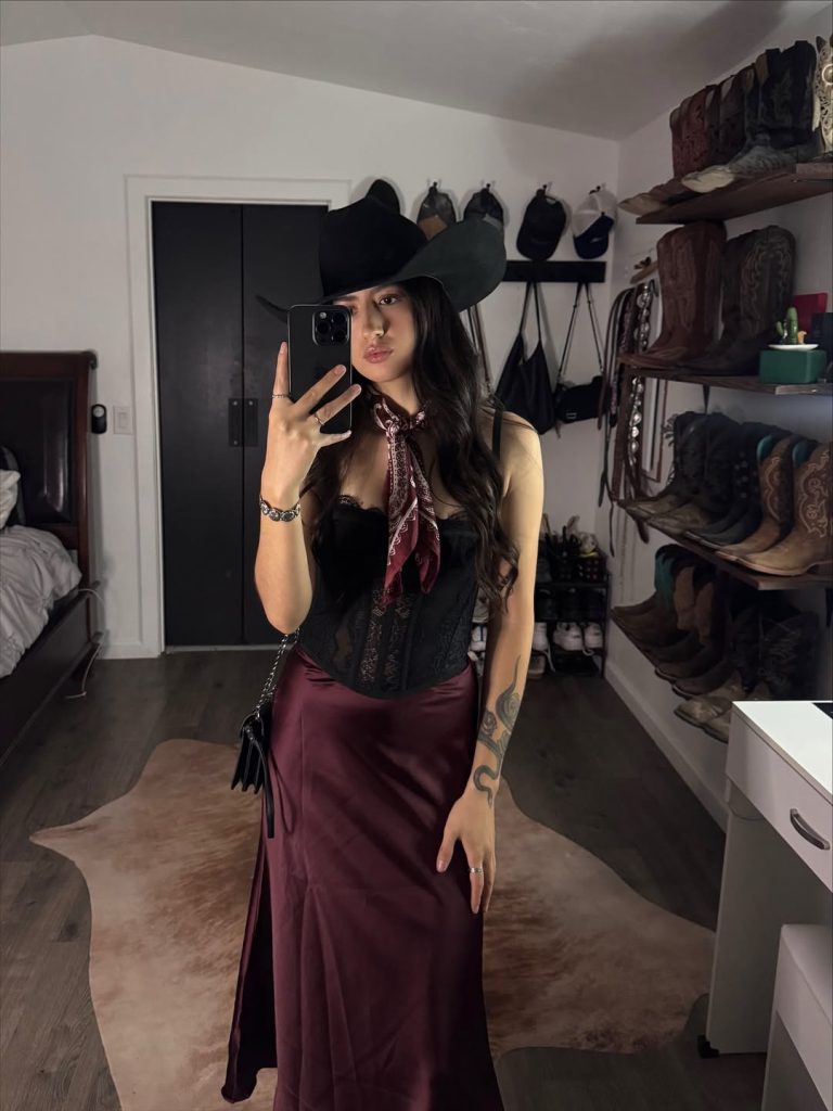 This particular outfit has a seductive and elegant air—it’s the type of outfit that provides you with a luxurious feel because of the materials used: the satin lingerie-style skirt and the white lace corset-inspired part of the outfit are sensual and elegant at the same time. The burgundy color and the scarf also work perfectly because it’s tied at the right point of the outfit—the neckline. This gives you a fashionably dressy air that’s perfect when you attend music festivals because you can readily combine western fashion elements along with the typical dress fashion. It’s modern because of the materials used and the cute factor because of the colorations involved