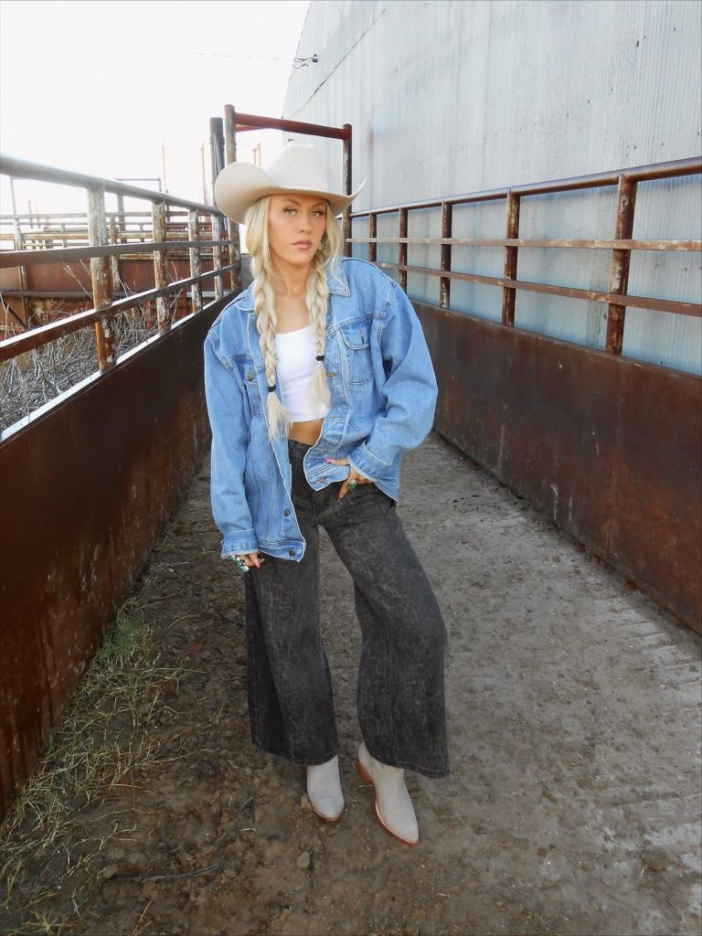 This outfit has this effortless cool factor—the oversized denim jacket, the braided hair, the loose crop top, the wide-leg jeans—that makes you feel as if she’s about to lasso a calf at the ranch and then pose for a photoshoot at the same time. The washed textures provide the right amount of edge.