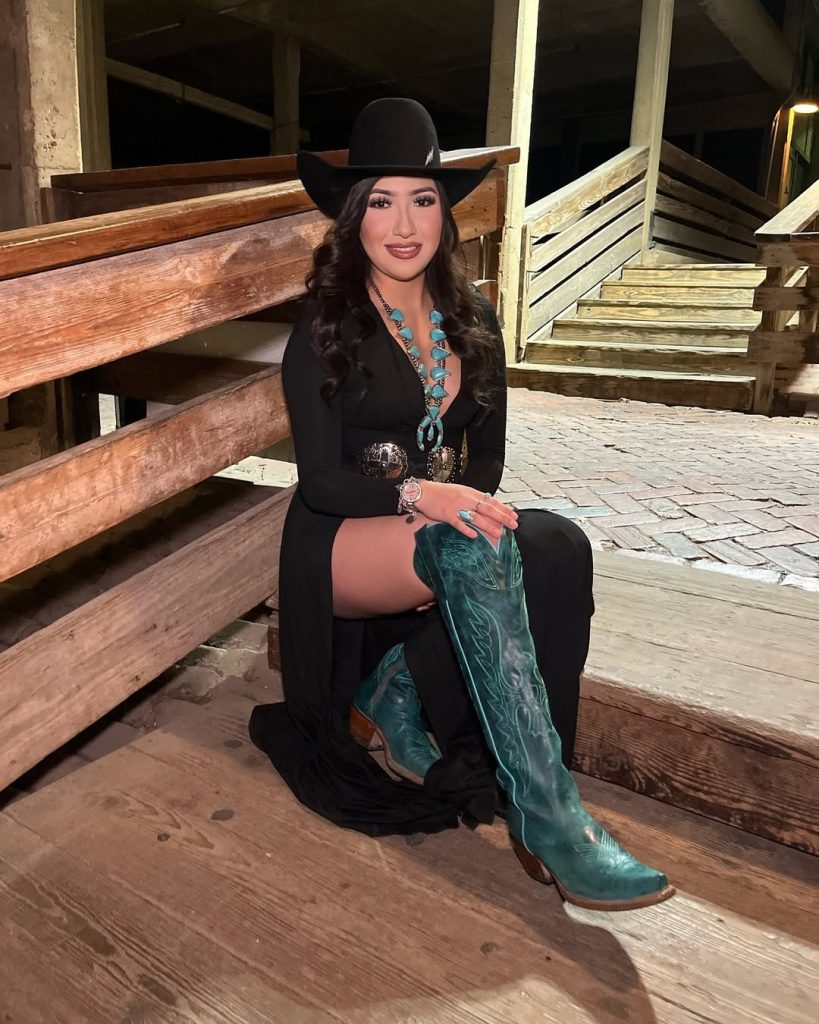 This ensemble embodies confidence—the dark-colored dress, the glittery turquoise jewelry, and the phenomenal matching boots create a statement dressy look that’s only suitable for the night. This amalgamation of beauty and the flirtatious rodeo chic perfectly captures the essence of the fashionably modern woman because it embodies this unique flair that exhibits itself inside of today’s society.